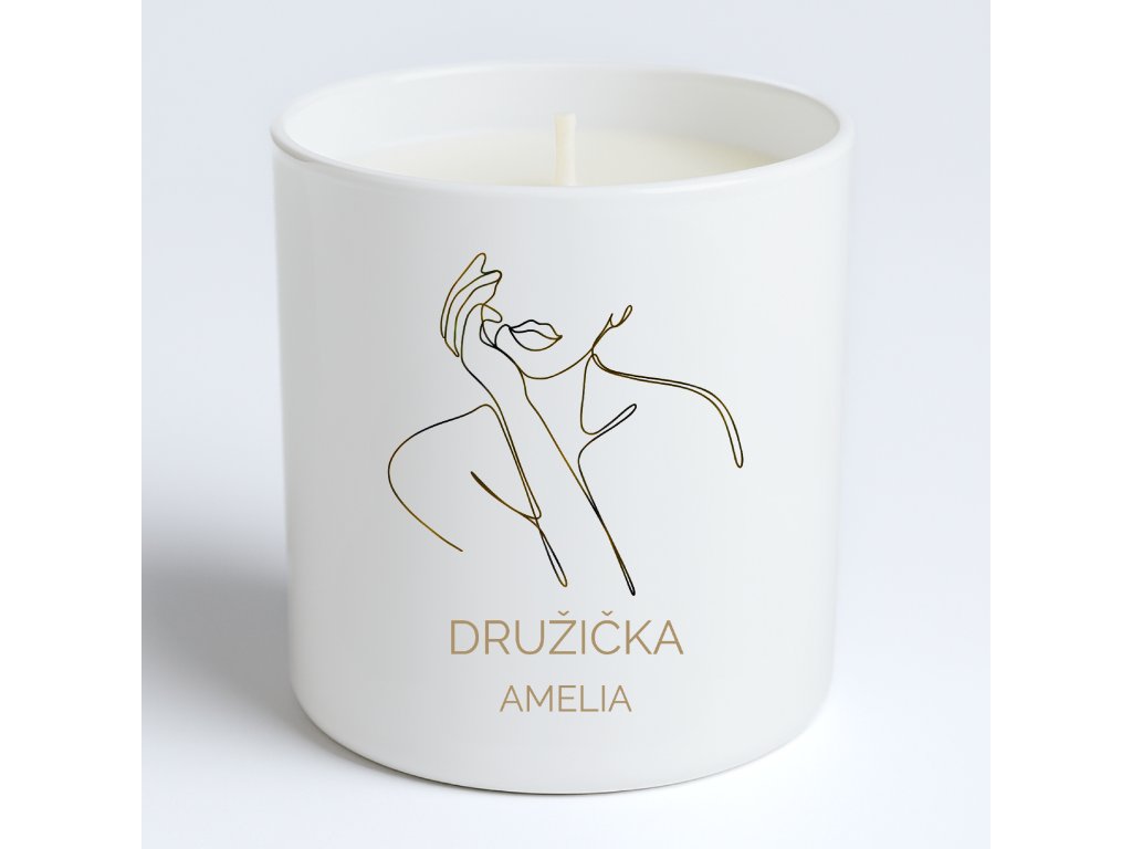 An elegant personalized gift set for bridesmaids in a minimalist style – includes a premium soy candle in a glossy white glass jar, a personalized name card, and matching handmade matches. Gold foil detail on the candle, printed version on matches and card.