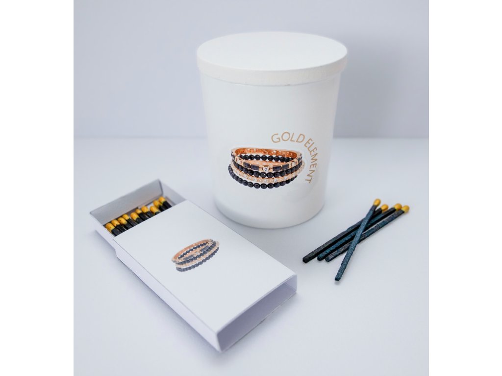A premium certified handmade candle made from 100% natural soy wax, free from dyes and chemical additives. Burn time approx. 40 hours. Each candle is part of a premium set with handmade matches – in a modern fashion style – glossy white jar with black and gold design and matching black-gold matches. A stylish accessory and perfect gift for fashion lovers.