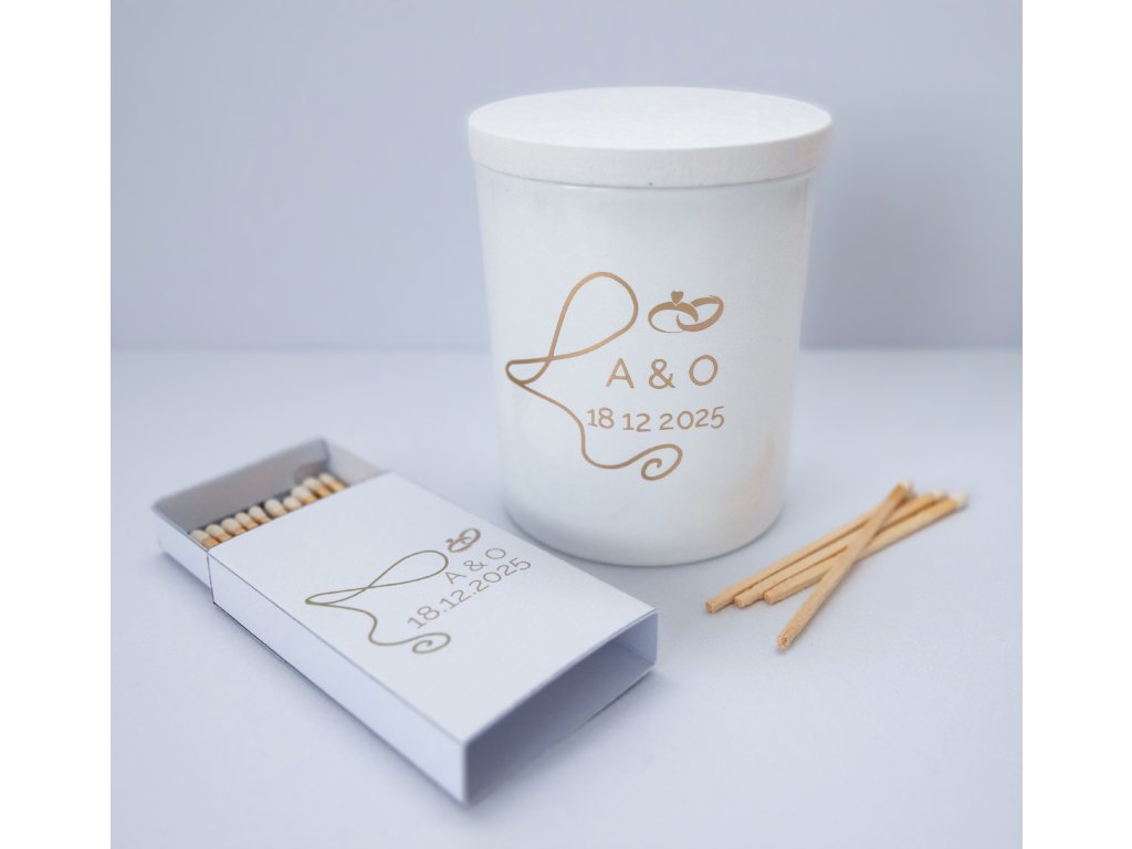 Each candle is part of a premium gift set with handmade matches – in a modern minimalist style with gold foil and elegant line art.