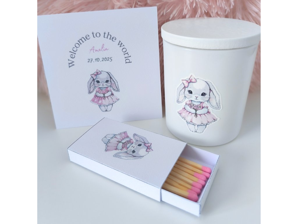 Prémiový darčekový set pre dievčatko: biela sviečka v skle, zápalky a karta s menom v ružovom Bunny štýle. Ideálne na narodenie či krst.