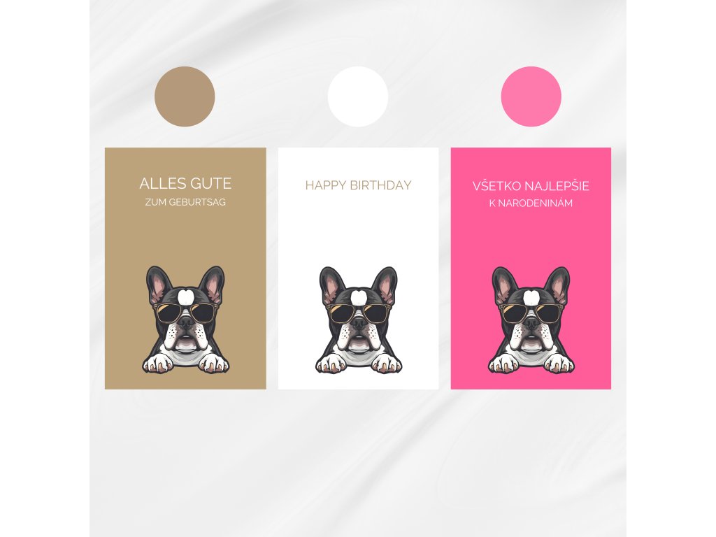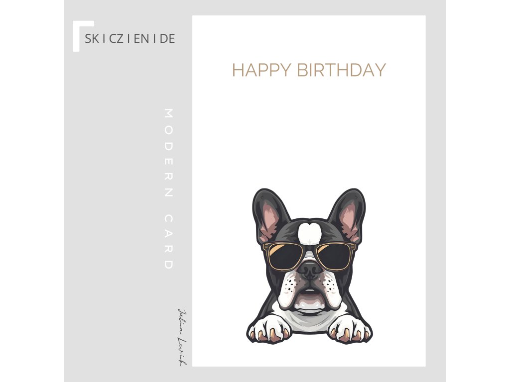 Štýlová moderná narodeninová karta s Mopsom I SK - CZ - EN - DE
