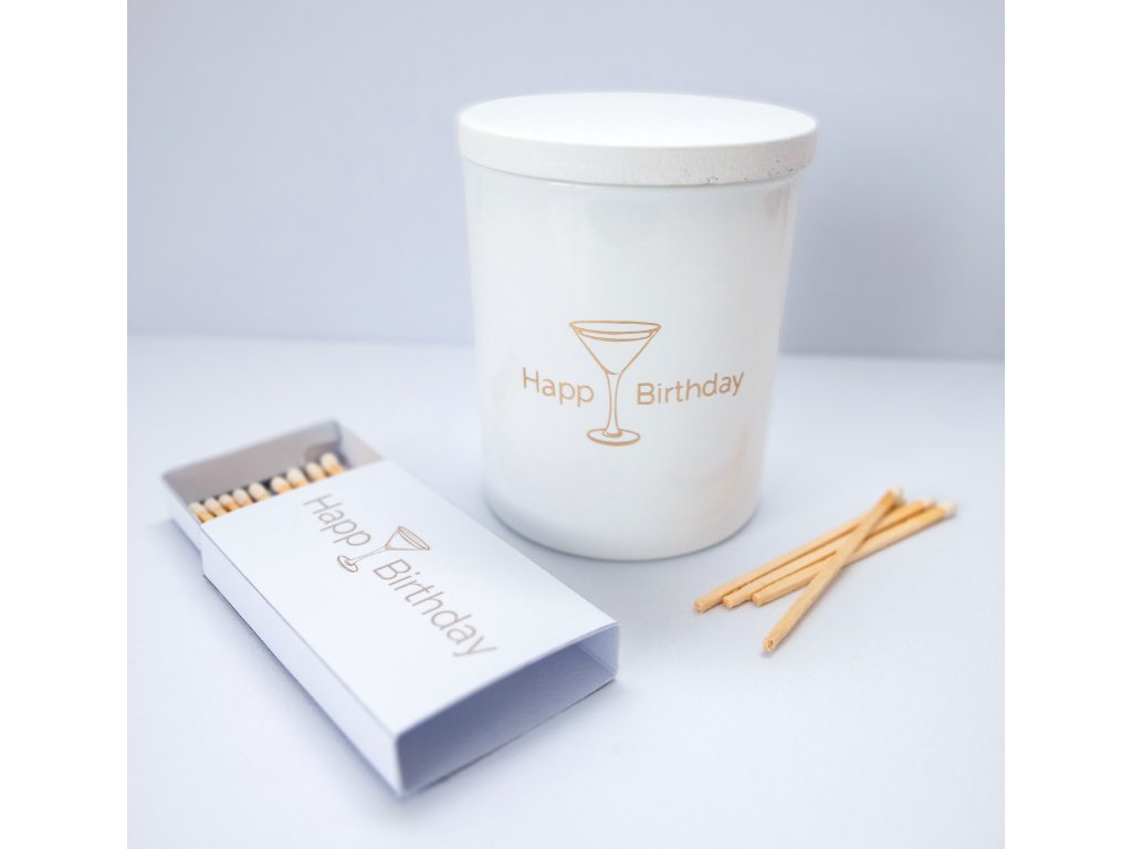 Každá sviečka je súčasťou prémiového setu so zápalkamy –s nápisom Happy Birthday v zlatej fólii. Tip na moderný darček.