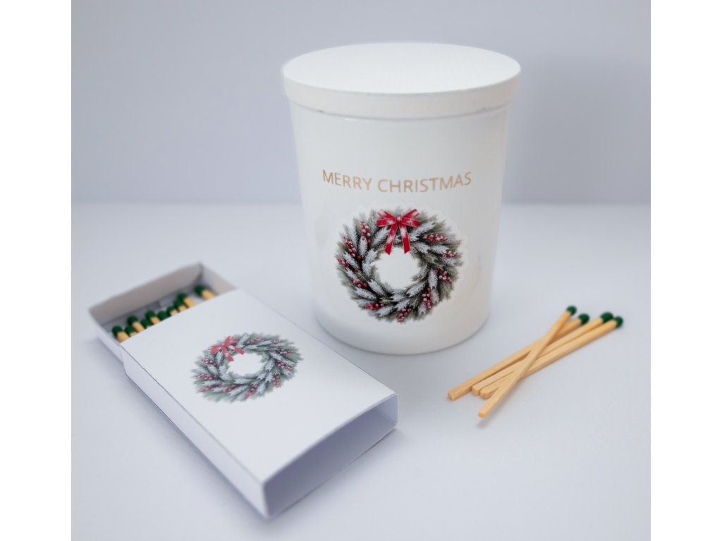 Každá sviečka je súčasťou prémiového setu so zápalkamy – Zimná edícia prémiovej ručne vyrábanej sójovej sviečky. Biely lesklý pohár s moderným venčekom.