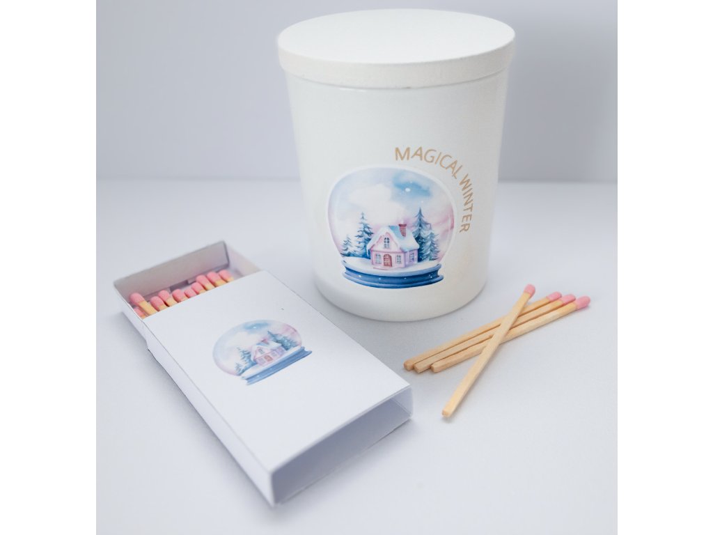 Každá sviečka je súčasťou prémiového setu so zápalkamy – Zimná edícia prémiovej ručne vyrábanej sójovej sviečky. Biely lesklý pohár s vianočnou guľou - Pastel.