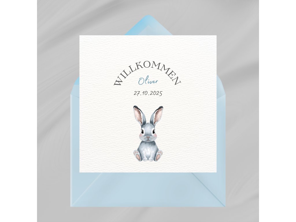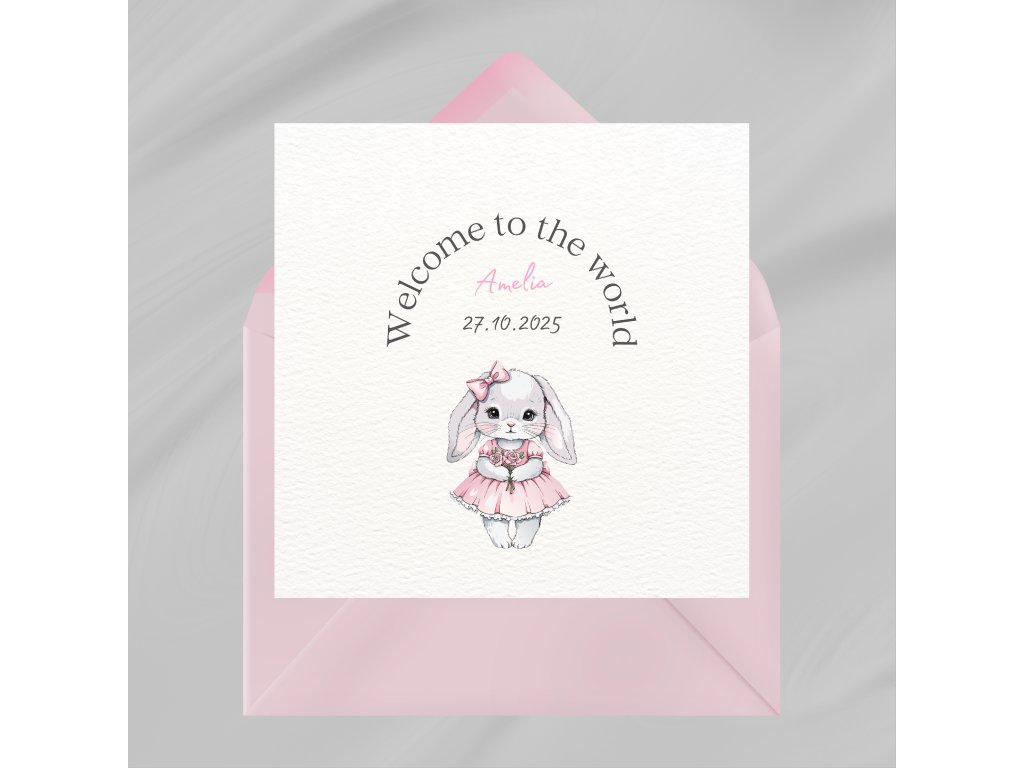 Elegantná personalizovaná karta Vitaj na svete s originálnou ilustráciou králička.